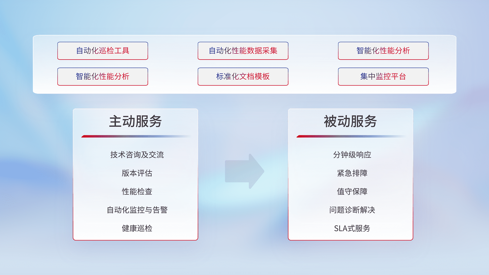 智能化工具和标准化文档,,,,保障服务质量,,,提供主动服务(包含技术咨询、、、版本评估、、、、性能检查、、自动化监控与告警、、、、健康巡检)和被动服务包含(分钟级响应、、紧急排障、、、、值守保障、、、问题诊断解决、、SLA服务)。。
